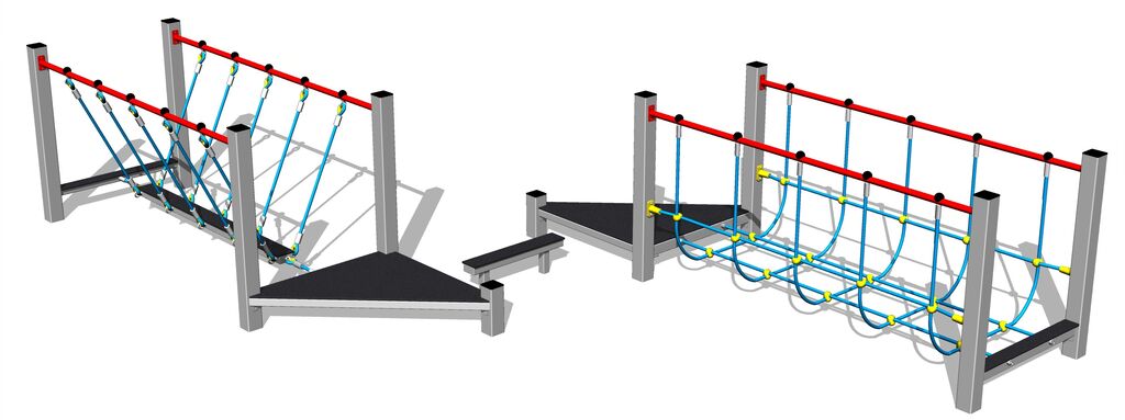 Lanová lávka so zaveseným trámom, lanová lávka so sieťou, kladina, 2x podesta. Na výber sú dve farebné varianty konštrukcie - hnedá a strieborná. Viac informácií