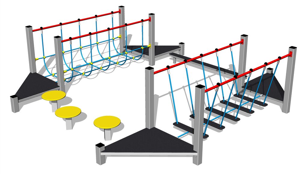 Lanová lávka s nášľapmi, lanová lávka so sieťou, kladina, 4x podesta, 3x step. Na výber sú dve farebné varianty konštrukcie - hnedá a strieborná. Viac informácií