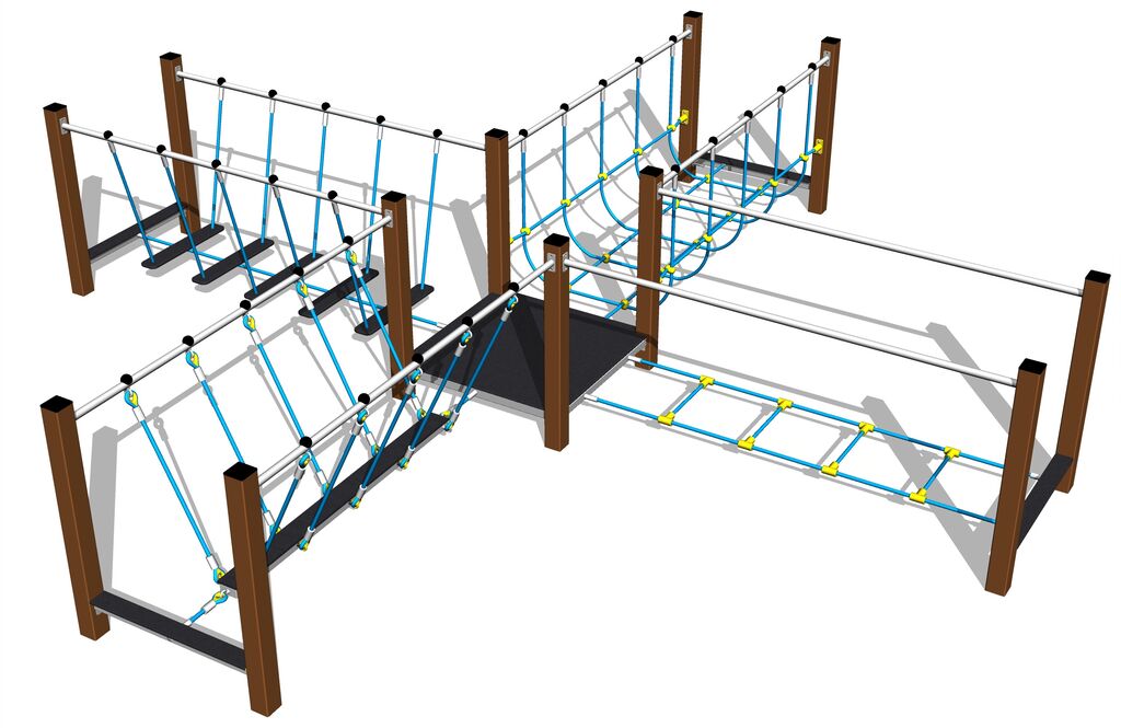 Lanová lávka, lanová lávka so zaveseným trámom, lanová lávka so sieťou, lanová lávka s nášľapmi, podesta. Na výber sú dve farebné varianty konštrukcie - hnedá a strieborná. Viac informácií