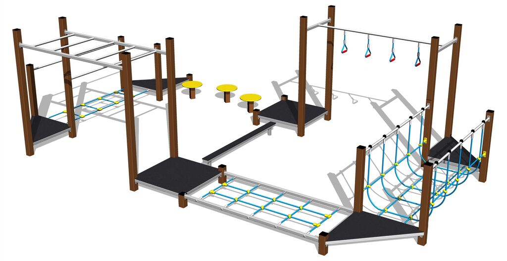 Lanová lávka, lanová lávka so sieťou, sieť, 6x podesta, 3x step, ručkovadlo, 4x lanové kruhy, kladina. Na výber sú dve farebné varianty konštrukcie - hnedá a strieborná. Viac informácií