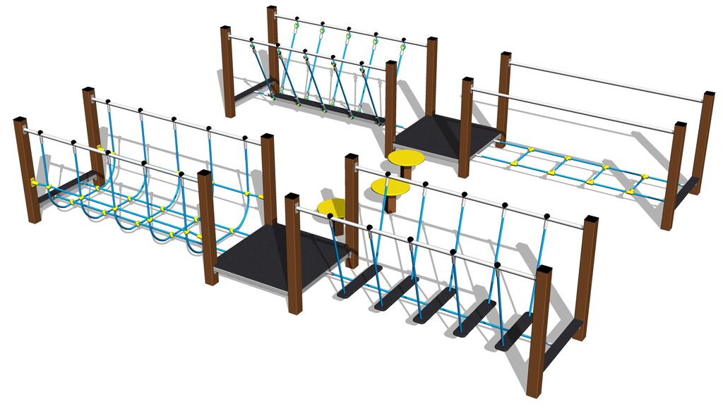 Lanová lávka, lanová lávka so zaveseným trámom, lanová lávka so sieťou, lanová lávka s nášľapmi, 2x podesta, 3x step. Na výber sú dve farebné varianty konštrukcie - hnedá a strieborná. Viac informácií