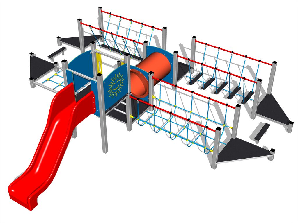 Lanová lávka so zaveseným trámom, lanová lávka so sieťou, lanová lávka s nášľapmi, sieť, preliezacie tunel, 2x kladina, 7x podesta, vež, šmýkačka, 2x bariéra, kolmý rebrík. Viac informácií