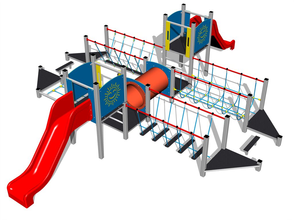 Lanová lávka so zaveseným trámom, lanová lávka so sieťou, lanová lávka s nášľapmi, sieť, preliezacie tunel, 2x kladina, 8x podesta, 2x vež, 2x šmýkačka, 4x bariéra, 2x kolmý rebrík. Viac informácií