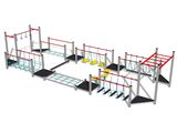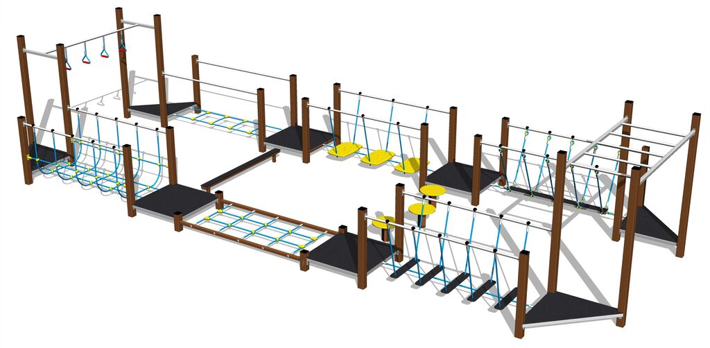 Lanová lávka, lanová lávka so zaveseným trámom, lanová lávka s plastovými nášľapmi, lanová lávka s nášľapmi, lanová lávka so sieťou, sieť, 8x podesta, 3x step, ručkovadlo, 4x lanové kruhy, kladina. Na výber sú dve farebné varianty konštrukcie - hnedá a strieborná. Viac informácií