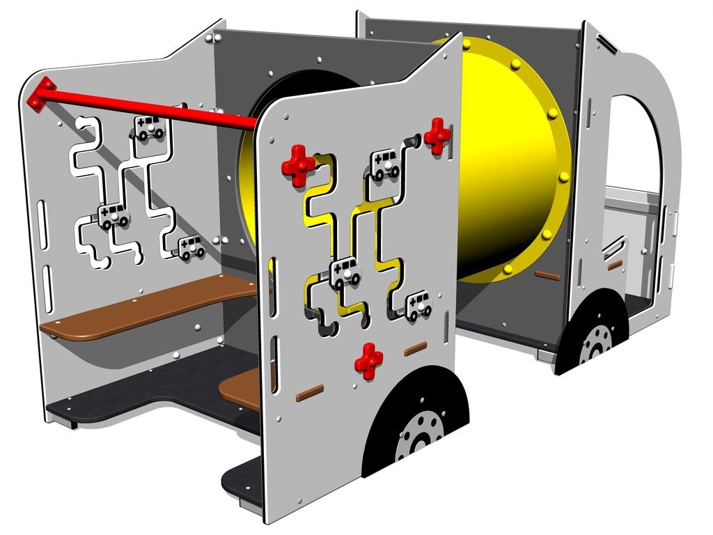 Preliezka s preliezacím tubusom - Ambulancia PP114K - celokovový - 1x preliezací tunel, ktorý je vyrobený z polyetylénu a je UV stabilný čo zaručuje vysokú farebnú stálosť. Výška pádu do 1 m, ako dopadová plocha postačí trávnik. Viac informácií