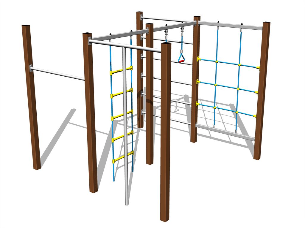 Lezecká stena, šplhacia sieť, rebriny, šplhacia tyč, hojdacie lanové kruhy.