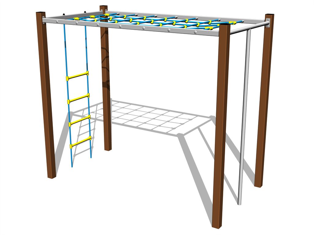 Šplhacia sieť a lanový rebrík sú vyrobené z materiálu HERKULES (16 mm lana z polypropylénu s vnútorným oceľovým jadrom) a sú spojené plastovými spojmi. Všetok spojovací materiál je pozinkovaný nebo nerezový.