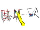 šplhacia tyč, hojdacie lanové kruhy, šplhacia sieť, rebriny, lanový rebrík, šikmý rebríkový výstup s kovovými nášľapy, šmýkačka, madlo, reťazová hojdačka s kovovým, pozinkovaným rahnom. Viac informácií