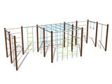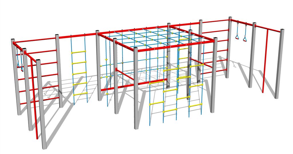 Lezecká stena, šplhacia sieť, rebriny, 2x šplhacia tyč, lanový rebrík, 2x šplhacie lano, rúčkovacia sieť.