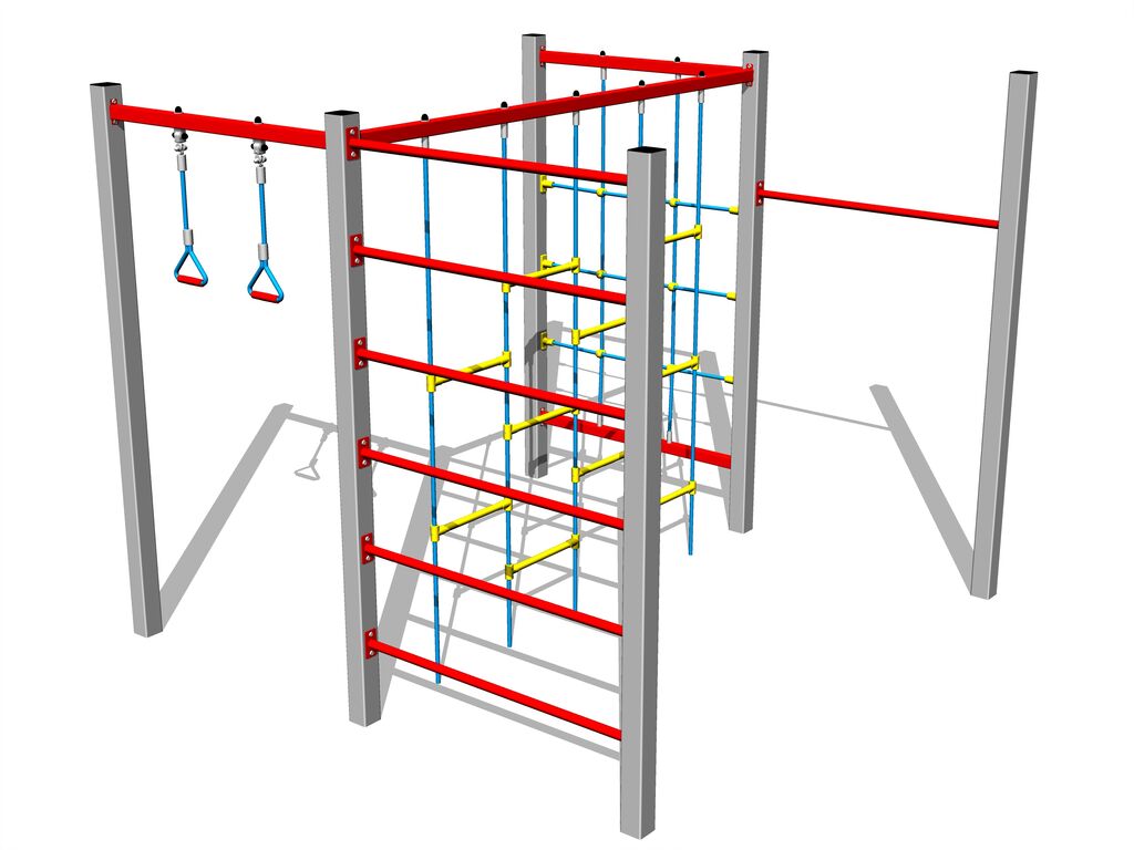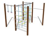 Lezecká stena, šplhacia sieť, rebriny, šplhacia tyč, hojdacie lanové kruhy.