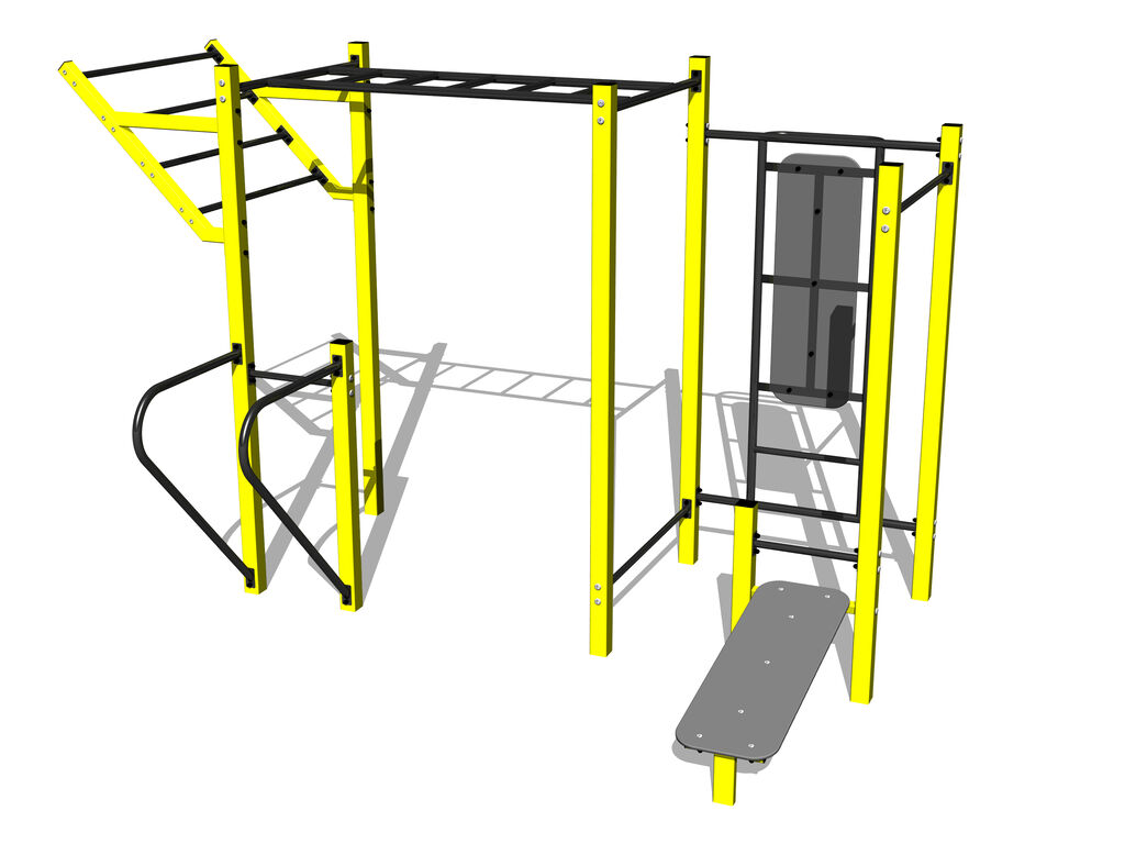 Nosná konštrukcia workoutovej zostavy je vyrobená z konštrukčnej ocele, ktorá je proti korózii ošetrená povrchovou úpravou - zinkovaním (docieli sa veľmi výrazné predĺženie životnosti herného prvku) alebo duplexným nástrekom práškovou vypaľovacou farbou podľa RAL. Všetky ďalšie kovové prvky napr.: madlá, bradlá, atď. sú tiež upravované zinkovaním alebo duplexným nástrekom práškovou vypaľovacou farbou podľa RAL, prípadne podľa priania objednávateľa môžu byť dané prvky v nerezovom prevedení. Všetky dosky lavíc a stúpačiek sú vyrobené z vysoko kvalitného plastu HDPE (vysokotlakový, celofarbený polyetylén, ktorý sa vyznačuje vysokou farebnou stálosťou, odolnou proti UV žiareniu a hlavne bezpečnosťou, pretože je nelámavý a nehrozí tak žiadne nebezpečné zranenie ostrými úlomkami). Všetok spojovací materiál je pozinkovaný alebo nerezový.