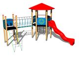 Štvorboká vež, šesťboká vež, šmýkačka, strieška, kolmý rebrík, lanový most medzi vežami, šikmý sieťový výlez, 5x bariéra z HDPE. Viac informácií