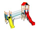 2x vež, 2x šmýkačka, strieška v tvare "A", bariéra z HDPE, šikmý výlez s lanom a nášľapy z HDPE, šikmý lanový most medzi vežami, požiarná tyč, šikmý sieťový výlez. Viac informácií