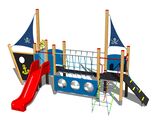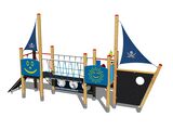 2x vež, šmýkačka, kovová bariérya usadená do dreveného rámu, 2x stožiar s vlajkou, kresliaca tabuľa, šikmý sieťový výlez, šikmý výlez s lanom a nášľapy z HDPE, most s lanovým zábradlím, vlajka, bariéra s priezory, kotva a kormidlo z HDPE, 2x bariéra z HDPE. Viac informácií