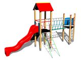 Štvorboká vež, trojboká vež, šmýkačka, strieška ve tvare "A", bariéra z HDPE, kolmý rebrík, šikmý výlez s lanom a nášľapy z HDPE, lanový most medzi vežami, šikmý sieťový výlez. Viac informácií