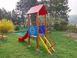 Vež, šmýkačka, strieška ve tvare "A", 2x bariéra, šikmý výlez s nášľapy a kovovými madlami. Viac informácií