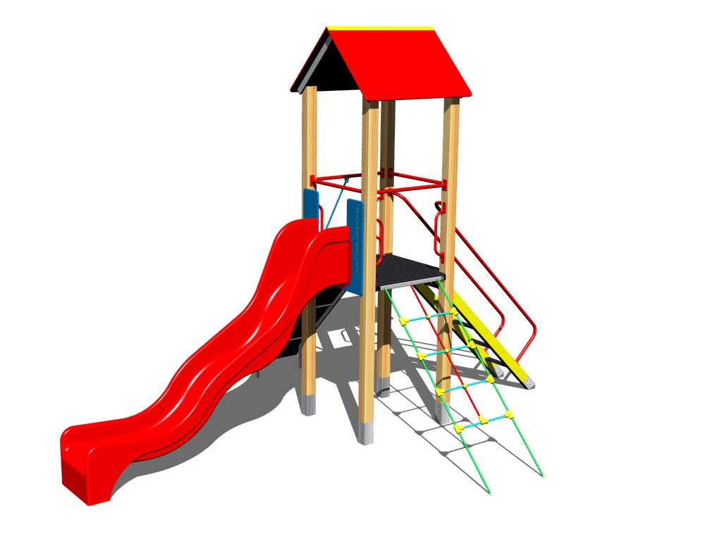 Vež, šmýkačka, strieška ve tvare "A", šikmý výlez s lanom a nášľapy z HDPE, šikmá šplhacia sieť, šikmý výlez s nášľapy a kovovými madlami. Viac informácií