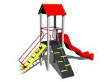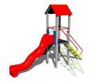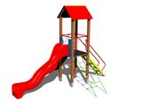 Vež, šmýkačka, strieška ve tvare "A", šikmý výlez s lanom a nášľapy z HDPE, šikmá šplhacia sieť, šikmý výlez s nášľapy a kovovými madlami. Viac informácií