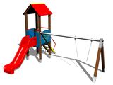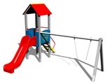 Sedadlo a houpačkové závesy nie sú súčasťou hojdačky. Nutné prikúpiť sedátko (1 ks) podľa výberu a houpačkové závesy (2 ks). Vež, strieška ve tvare "A", 2x bariéra, šikmý výlez s nášľapy a kovovými madlami, kovové rahno. Viac informácií