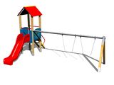 Sedadlo a houpačkové závesy nie sú súčasťou hojdačky. Nutné prikúpiť sedátko (2 ks) podľa výberu a houpačkové závesy (4 ks). Vež, strieška ve tvare "A", 2x bariéra, šikmý výlez s nášľapy a kovovými madlami, kovové rahno. Viac informácií
