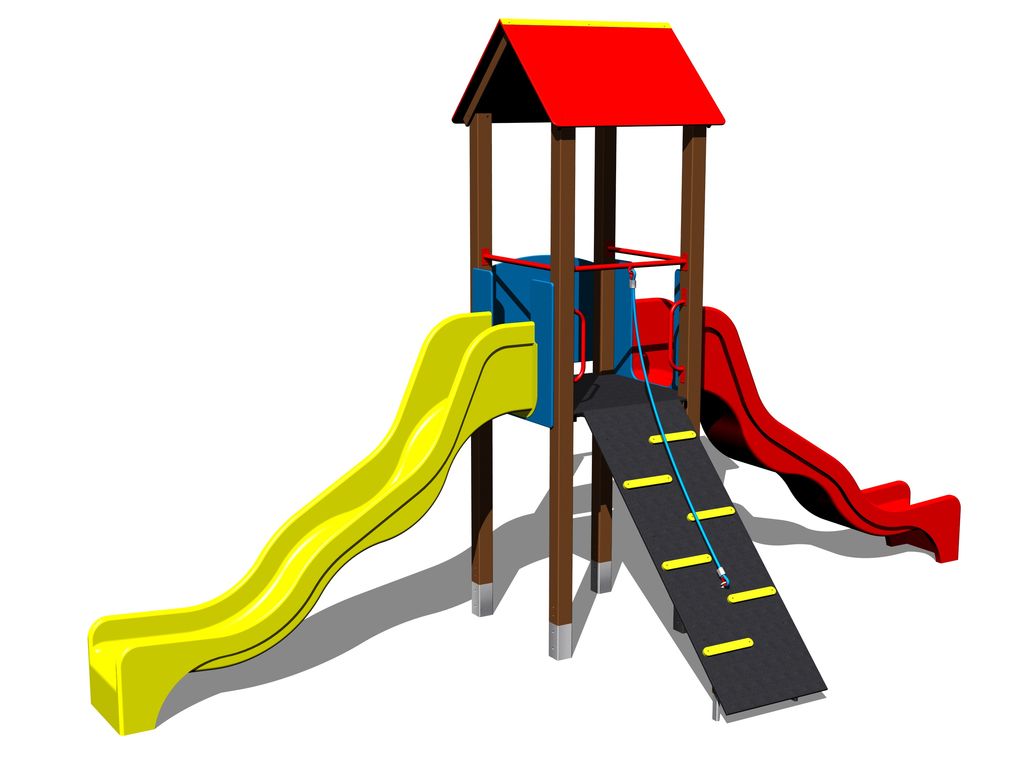 Vež, strieška ve tvare "A", 2x šmýkačka, bariéra, šikmý výlez s lanom a nášľapy. Viac informácií