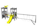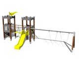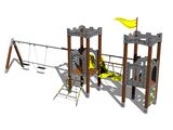 Sedadlo a houpačkové závesy nie sú súčasťou hojdačky. Nutné prikúpiť sedátko (2 ks) podľa výberu a houpačkové závesy (4 ks). 2x vež, šmýkačka, 3x bariéra z HDPE, šikmý sieťový výlez, kolmá lezecká stena na veži s nášľapmi, vlajka, 2x cimburie z HDPE, kovové rahno, lanový most s nášľapmi. Viac informácií