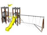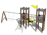 Sedadlo a houpačkové závesy nie sú súčasťou hojdačky. Nutné prikúpiť sedátko (2 ks) podľa výberu a houpačkové závesy (4 ks). 2x vež, šmýkačka, 3x bariéra z HDPE, šikmý sieťový výlez, kolmá lezecká stena na veži s nášľapmi, vlajka, 2x cimburie z HDPE, kovové rahno, lanový most s nášľapmi. Viac informácií
