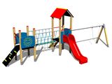 Sedadlo a houpačkové závesy nie sú súčasťou hojdačky. Nutné prikúpiť sedátko (1 ks) podľa výberu a houpačkové závesy (2 ks). 2x vež, šmýkačka, strieška ve tvare "A", 3x bariéra z HDPE, šikmý rebríkový výstup s kovovými nášľapy, šikmý výlez s lanom a nášľapy z HDPE, lanový most medzi vežami, kovové rahno. Viac informácií
