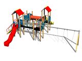 Sedadlo a houpačkové závesy nie sú súčasťou hojdačky. Nutné prikúpiť sedátko (2 ks) podľa výberu a houpačkové závesy (4 ks). 4x vež, 2x šmýkačka, 2x strieška v tvare "A", 5x bariéra z HDPE, kolmý rebrík, šikmý výlez s nášľapy a kovovými madlami, šikmý výlez s lanom a nášľapy z HDPE, lanový most medzi vežami, most s lanovým zábradlím, preliezací tunel medzi vežami, kolmá šplhacia sieť v tvare pavučiny, kovové rahno. Viac informácií