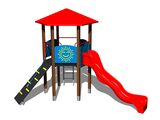 Vež, šmýkačka, strieška, 3x bariéra z HDPE, kolmý rebrík, šikmý výlez s lanom a nášľapy z HDPE. Viac informácií